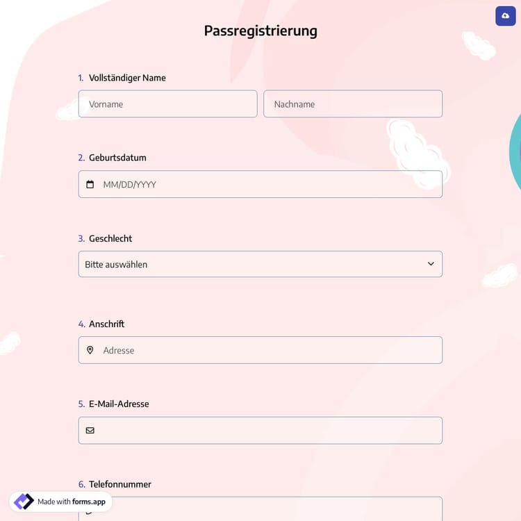 Online-Formulare haben in den meisten Bereichen, einschließlich der Passanmeldungen, Papierformulare ersetzt. Wenn Sie auf der Suche nach einer Möglichkeit sind, Anmeldungen zu sammeln, ist ein Online-Anmeldeformular für den Pass die beste Wahl. Die gute Nachricht ist, dass Sie mit dem Modell für das Passanmeldeformular von forms.app ganz einfach eins erstellen können!