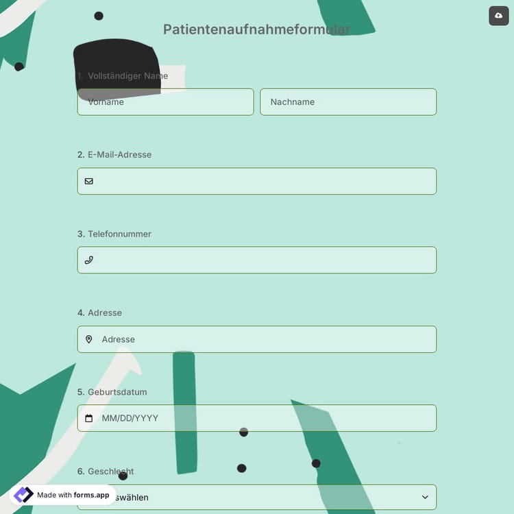 Ein Patientenaufnahmeformular ist ein Dokument zur Erfassung medizinischer Daten über den Patienten, wie z. B. genetische Erkrankungen, Symptome und vergangene Operationen. Durch die Erstellung eines Online-Aufnahmeformulars auf forms.app können Sie die Datenerfassung einfach automatisieren und Zeit sparen. Darüber hinaus ist es dank der kostenlosen Vorlage für Patientenaufnahmeformulare von forms.app möglich, Ihr Formular zu erhalten. Also legen Sie jetzt los und erstellen Sie noch heute Ihr individuelles Formular!