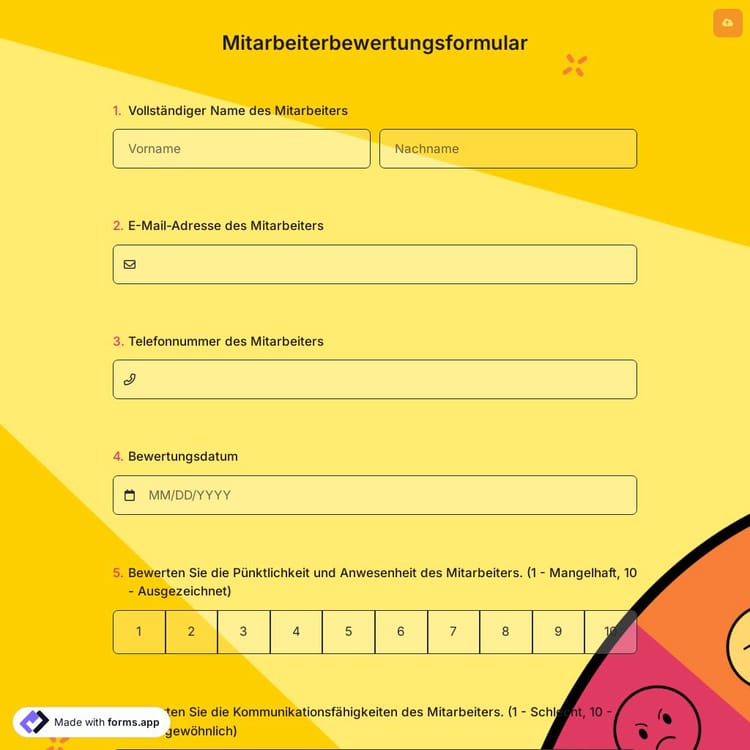Die Identifizierung der Bereiche, in denen Ihre Mitarbeiter möglicherweise zusätzliche Schulungen oder Unterstützung benötigen, ist wichtig, um Pläne zur Verbesserung ihrer Leistung zu erstellen. Verwenden Sie das kostenlose Mitarbeiterbewertungsformular von forms.app, um Ihr eigenes Formular zu erstellen und den aktuellen Stand Ihrer Mitarbeiter zu sehen!