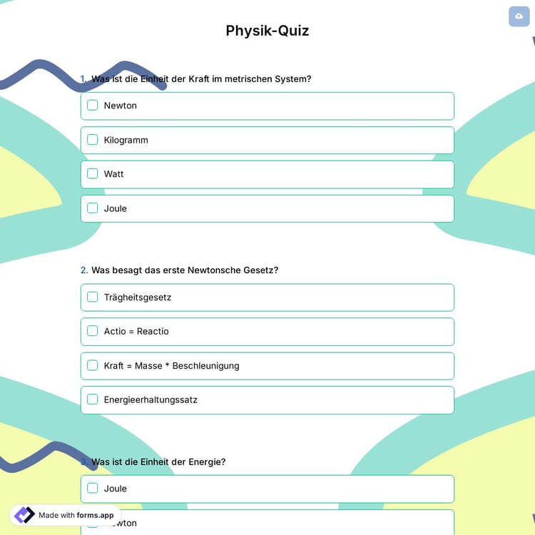Ein Online-Physik-Quiz-Modell ist eine großartige Möglichkeit, Schülerinnen und Schüler in das Lernen von Physik einzubeziehen. Es ermöglicht ihnen, ihr Wissen über Konzepte zu testen und gibt Lehrkräften die Möglichkeit zu sehen, welche Konzepte im Unterricht mehr Aufmerksamkeit benötigen. Mit forms.app können Sie ganz einfach eines erstellen!