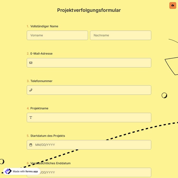 Halten Sie bei der Arbeit an einem Projekt mit einem Projektverfolgungsformular den Fortschritt Ihres Teams im Auge. Verwenden Sie diese kostenlose Projektverfolgungsformularvorlage auf forms.app, bearbeiten Sie die Frage und gestalten Sie Ihr Formular mit Dutzenden von Designs ansprechend. Klicken Sie auf die Schaltfläche "Vorlage verwenden" und legen Sie jetzt los!