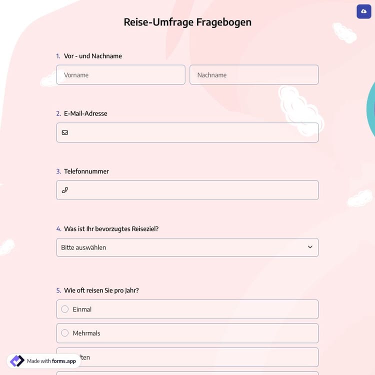 Eine Reiseumfrage wird verwendet, um Informationen von Personen zu sammeln, die kürzlich gereist sind, sei es aus Vergnügen oder geschäftlich. Sie kann Reiseunternehmen dabei helfen, die Vorlieben und Bedürfnisse von Reisenden zu verstehen und Möglichkeiten zur Verbesserung des Reiseerlebnisses zu identifizieren. Mit forms.app können Sie in nur wenigen Minuten eine individuelle Reiseumfrage erstellen!
