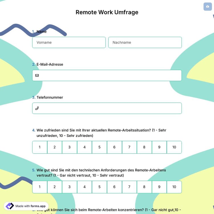 Ein weiteres Merkmal von Umfragen zur Remote-Arbeit besteht darin, dass sie die Erfahrungen Ihrer Mitarbeiter messen, die derzeit remote arbeiten. Möglicherweise haben Ihre Mitarbeiter Probleme und Probleme mit der Fernarbeit oder möchten weiterhin aus der Ferne arbeiten. Der einfachste und effizienteste Weg, dies herauszufinden, sind Umfragen zur Remote-Arbeit. Sie können Ihre Fragen offen, mit kurzen Antworten oder mit Optionen stellen. Es liegt an Ihnen, die für Ihre Mitarbeiter optimalste Methode zu wählen. Sie müssen sich nicht darum kümmern, denn forms.app bietet Ihnen alle Arten von Bearbeitungs- und Anpassungsmöglichkeiten.
