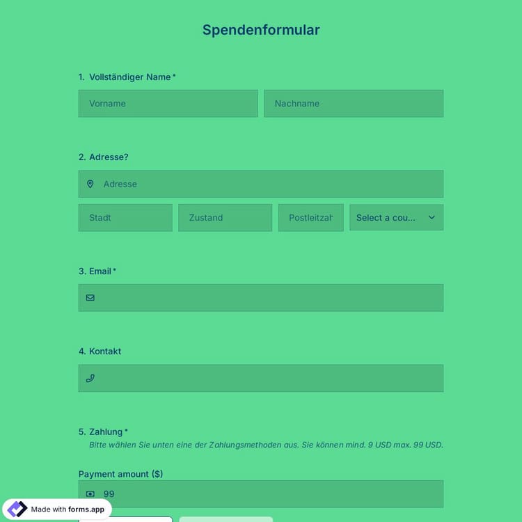 Wenn Sie Spenden für Ihr Projekt, Unternehmen oder Ihre Veranstaltung suchen, brauchen Sie nur ein Online-Spendenformular. Mit einem Online-Formular erreichen Sie mehr Menschen und machen den Spendenprozess für Ihre potenziellen Spender kinderleicht. Außerdem unterstützt forms.app viele Zahlungsoptionen für wohltätige Spenden, Online-Fundraising und andere Spenden.