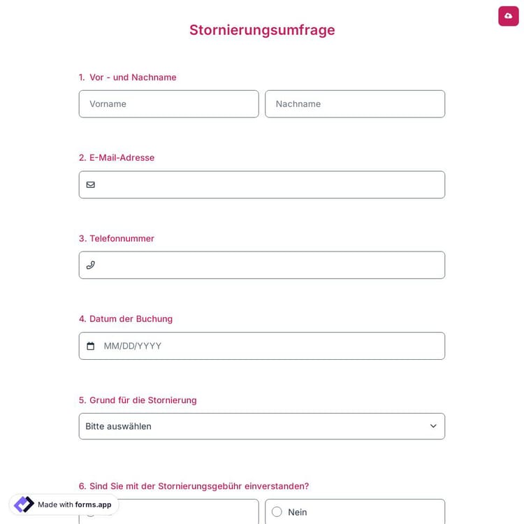 Bei Stornierungsumfragen, auch Kundenabwanderungsumfragen oder Exit-Umfragen genannt, handelt es sich um eine Art Formular, bei dem Sie fragen, warum ein Benutzer oder Verbraucher, der Ihr Produkt oder Ihre Dienstleistung nutzt, Ihr Produkt/Ihre Dienstleistung nicht mehr nutzt. forms.app bietet Ihnen die Möglichkeit, diese Umfrage mit verschiedenen Individualisierungsmöglichkeiten kostenlos zu erstellen. Beginnen Sie mit der Erstellung Ihrer Umfrage mit der unten stehenden Vorlage für eine Stornierungsumfrage!