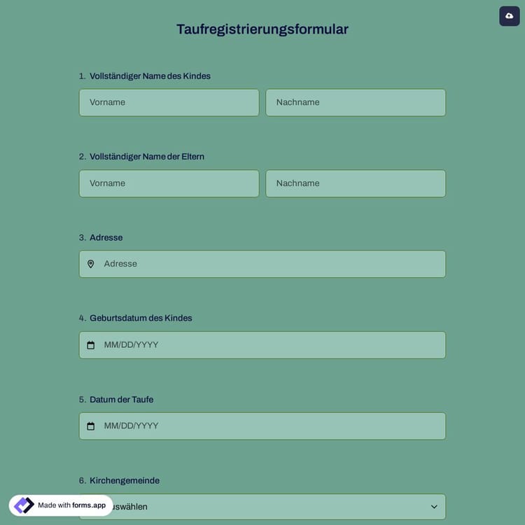 Ein Taufanmeldeformular ist ein Online-Dokument, das von Kirchen verwendet wird, um Informationen über die Personen zu sammeln, die getauft werden sollen. Dieses Formular wird in der Regel verwendet, um Anfragen für eine Taufzeremonie zu erfassen und kann Datum, Uhrzeit und Ort enthalten. Mit dem kostenlosen Taufanmeldeformular von forms.app können Sie ganz einfach ein professionelles Formular erstellen, das Ihnen dabei hilft, alle erforderlichen Informationen zu sammeln.