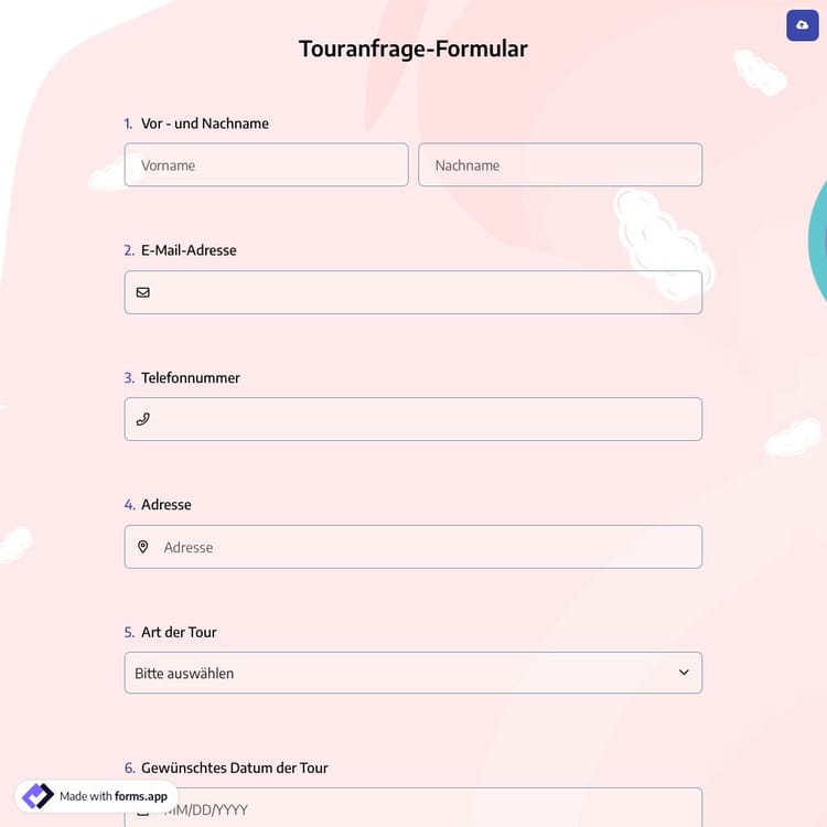 Wenn Sie eine effektive Möglichkeit suchen, Anfragen für eine Reiseführer oder Reiseagentur zu sammeln, ist dieses kostenlose Formular für die Anforderung einer Tour perfekt für Sie. Mit diesem Formular können Sie professionellen Service für Ihre Kunden anbieten. Zudem bietet forms.app verschiedene Anpassungsfunktionen und Freigabeoptionen. Um Ihr Anforderungsformular für Tour zu erstellen, klicken Sie auf die Schaltfläche "Vorlage verwenden".