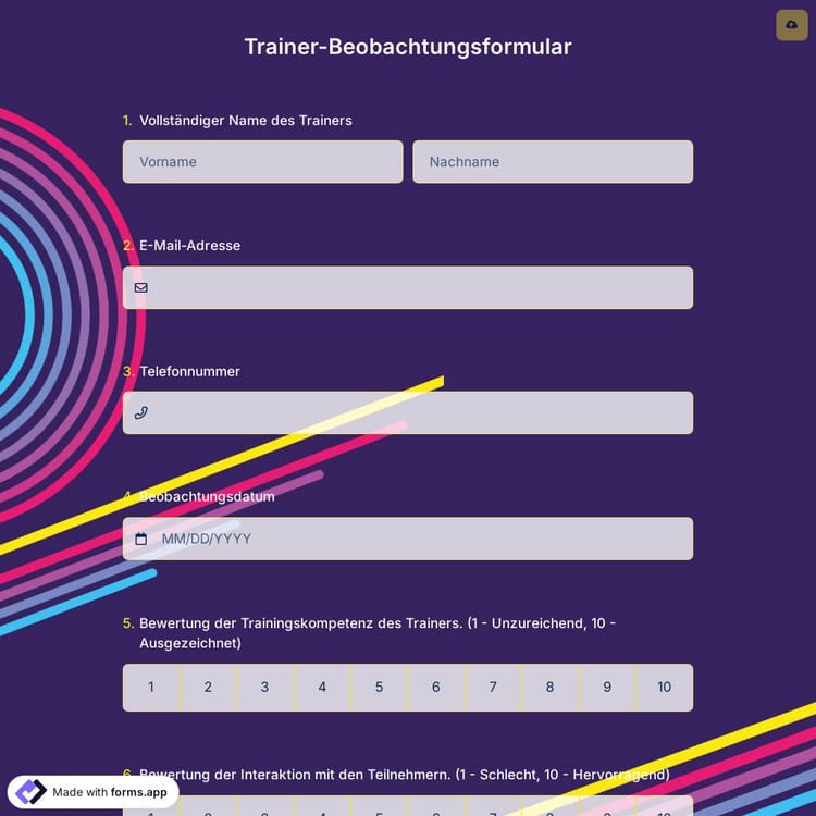 Das Training, sei es im Geschäfts-, Sport- oder sozialen Umfeld, ist ein sehr wertvoller Aspekt zur Verbesserung von Dingen. Das Training ist nur so gut wie die Leistung des Trainers. Ein Online-Trainer-Beobachtungsformular hilft Ihnen dabei, dies herauszufinden. Beginnen Sie mit dem kostenlosen Trainer-Beobachtungsformular-Modell auf forms.app!