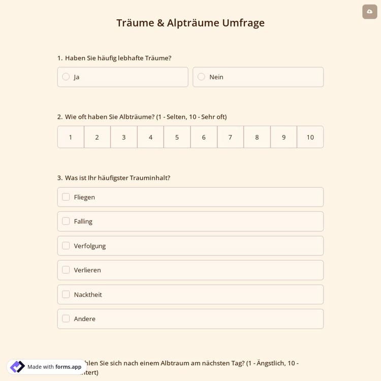 Möchten Sie sehen, welchen Einfluss Träume und Albträume auf Menschen haben? Mit dem Modell für Traum- und Albtraumumfragen können Sie herausfinden, welche Visionen Menschen in ihrem täglichen Leben haben und welche Auswirkungen sie haben. Melden Sie sich bei forms.app an, um jetzt Ihr eigenes Formular zu erstellen!