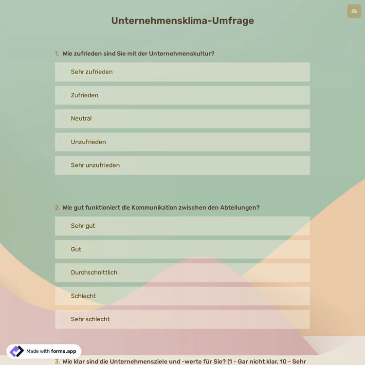 Das Ziel der unternehmerischen Klimaaktion ist es, die Bedeutung des Umweltschutzes in den Aktivitäten des Unternehmens zu erhöhen. Es stehen verschiedene Feldtypen für Ihre Umfrage in forms.app zur Verfügung. Beginnen Sie mit der Erstellung einer Umfrage mit dieser Vorlage, die auf forms.app verfügbar ist, um Daten und Feedback zur Klimaaktion in Ihrem Unternehmen zu sammeln.