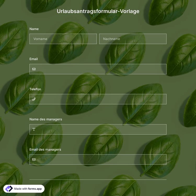 Ein Urlaubsantragsformular hilft Mitarbeitern, die Personalabteilung oder Vorgesetzte über ihre Urlaubsanträge zu informieren. Wenn ein Mitarbeiter einen Urlaubsantrag hat, wissen Sie, warum und wann er oder sie von der Arbeit abwesend ist. Um Ihr Online-Formular zu erstellen, verwenden Sie noch heute die kostenlose Urlaubsantragsformular-Vorlage von forms.app!