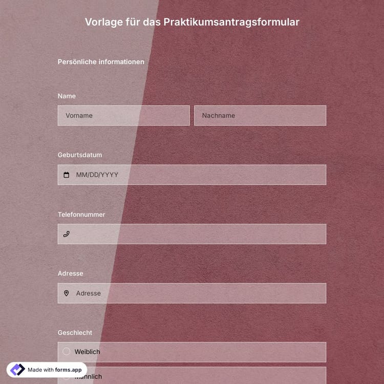 Ein Online-Praktikumsbewerbungsformular hilft Ihnen, die notwendigen Informationen für Praktikumsplätze zu sammeln. Und es beschleunigt den Bewertungsprozess für Sie. Mit einem Bewerbungsformular für ein Praktikum können sich Menschen jederzeit ganz einfach auf offene Stellen bewerben. Wählen Sie die Bewerbungsformularvorlage von forms.app und haben Sie die besten Kandidaten für Praktika in Ihrem Unternehmen!