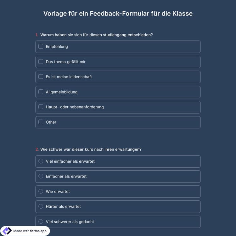 Ein Kurs-Feedback-Formular bietet eine großartige Möglichkeit, Feedback von Kursteilnehmern zu einem Kurs einzuholen. Mit einem Feedback-Formular können die Studierenden leicht ihre Erwartungen und ihre Meinung zum Kurs äußern. Verwenden Sie die kostenlose Formularvorlage für das Klassenfeedback von forms.app, um noch heute wertvolles Feedback zu sammeln!