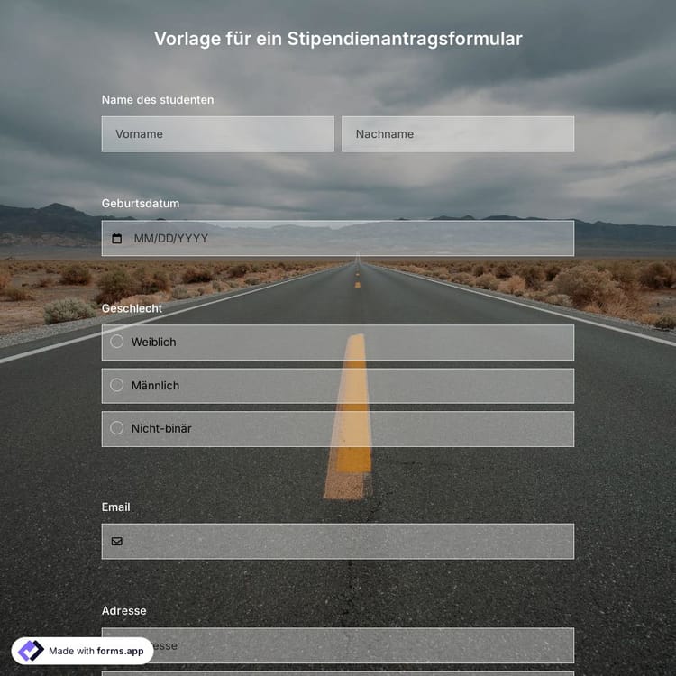Das Erstellen eines Stipendienantragsformulars für Online-Bewerbungen ist mit forms.app einfacher denn je. Sie können unsere kostenlose Vorlage für Ihr Stipendienprogramm verwenden und damit beginnen, persönliche und Kontaktinformationen der Bewerber zu sammeln. Unsere vollständig bearbeitbare Vorlage für ein Stipendienantragsformular bietet Ihnen die Flexibilität, die Sie beim Erstellen Ihres Formulars benötigen. Sie können das Musterformular für jede Art von Stipendium verwenden, z. B. für ein High School- oder College-Stipendium.
