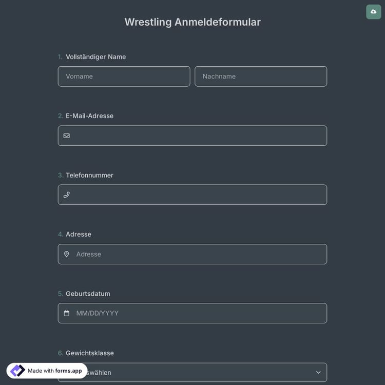 Sucht Ihre Organisation potenzielle Wrestler für Ihre Wrestling-Events? forms.app bietet eine effektive Methode. Verwenden Sie jetzt diese Formularvorlage für die Anmeldung zum Wrestling und erstellen Sie Formulare für all Ihre zukünftigen Wrestling-Events!