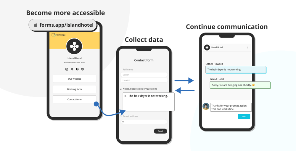 Collecting feedback and communicating with guests are the key points for hotels. Especially for bigger hotels, keeping up with each guest’s demands is harder. At this point, forms.app Profile is an excellent chance for your hotel to help increase customer satisfaction and reach more people.