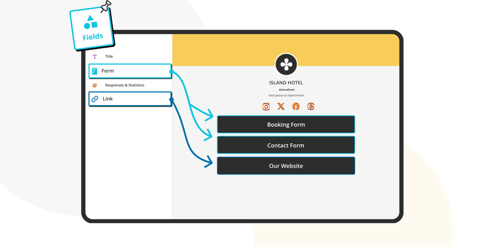 From the “Fields” part, you can add your hotel's website link or social media account, including Instagram, X, or Facebook. You can also add the essential forms you created for your guests, like an order form with a product basket, a booking form, etc. Having the forms’ links in your profile is a great convenience for your guests.