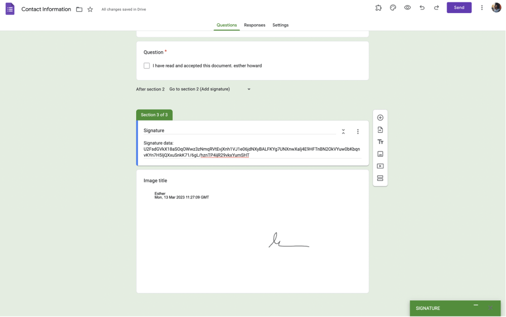 Adding a signature field to a Google Form using a plugin or app is essential to gathering electronic signatures. It is a secure and efficient alternative to gathering handwritten signatures for users to sign.
