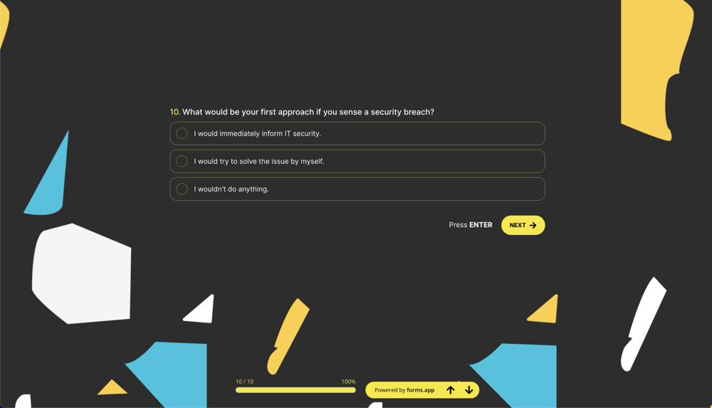 In conclusion, with a small effort, you can raise employee awareness of computer security and ensure the safety of your company's information. Creating a survey is a cost-efficient method to influence your workers about cyber security and cybercrimes. Using forms.app, you can create free surveys, and using these questions will save you time. Just start from scratch or customize your survey and start now.