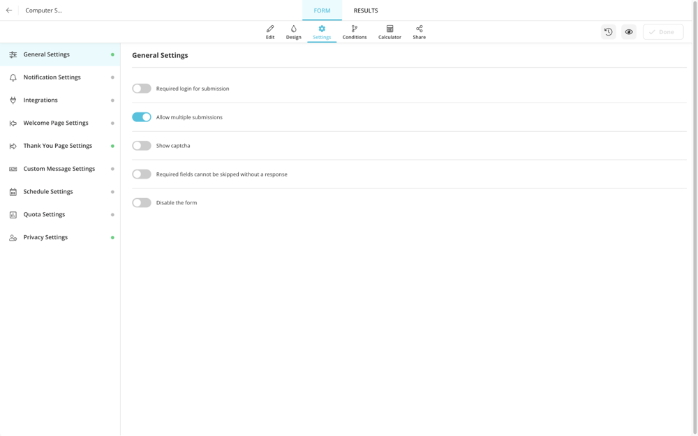 4 - Adjust your general settings: You can change your notification settings and also add thank you page. Also, enable CHAPTCA and disable multiple submissions if you don't want multiple submissions.