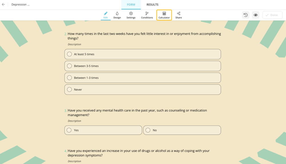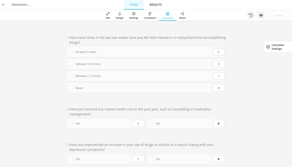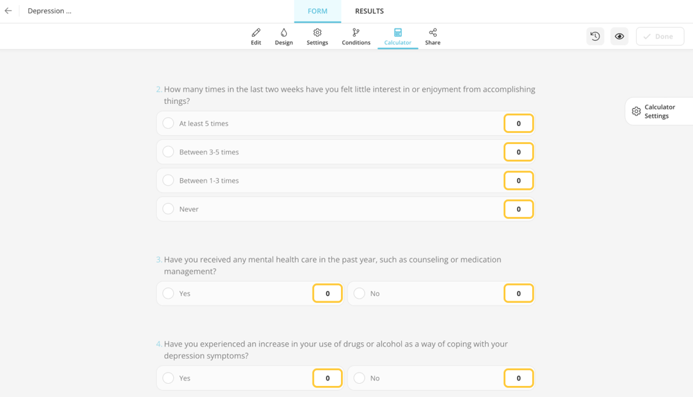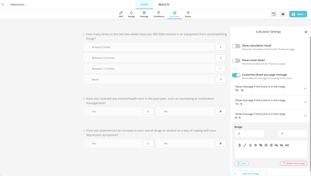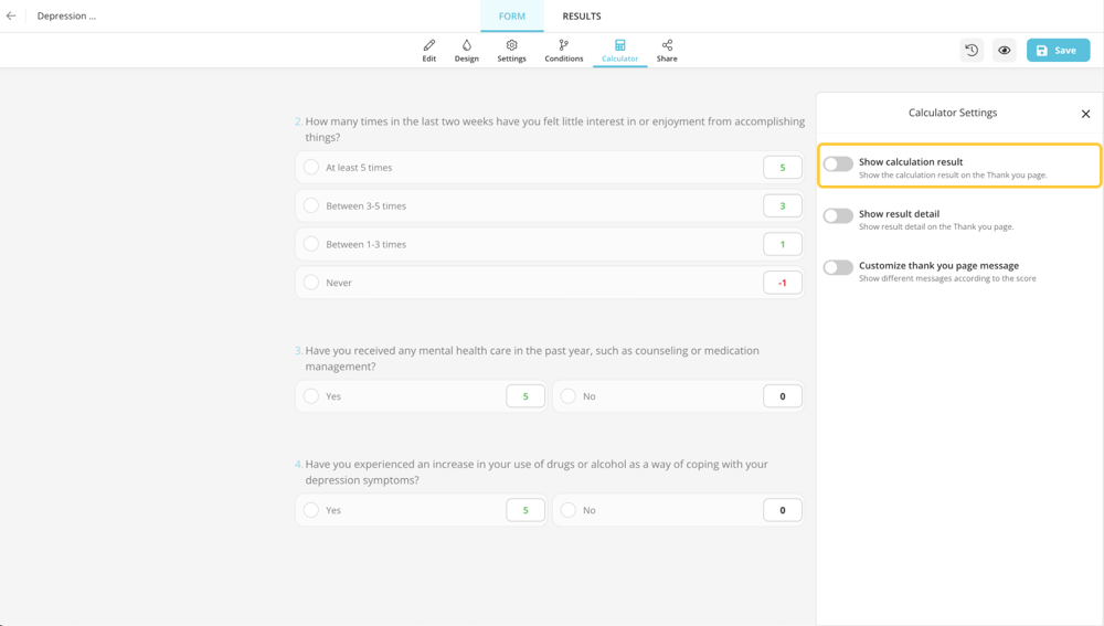 forms.app offers a calculator feature that can be used for measurement and showing results. You can give scores to each answer by setting up calculations. By assigning scores to necessary fields, you can get automated results for your depression surveys. Follow these 5 easy steps to use the calculator feature actively: