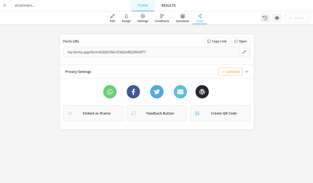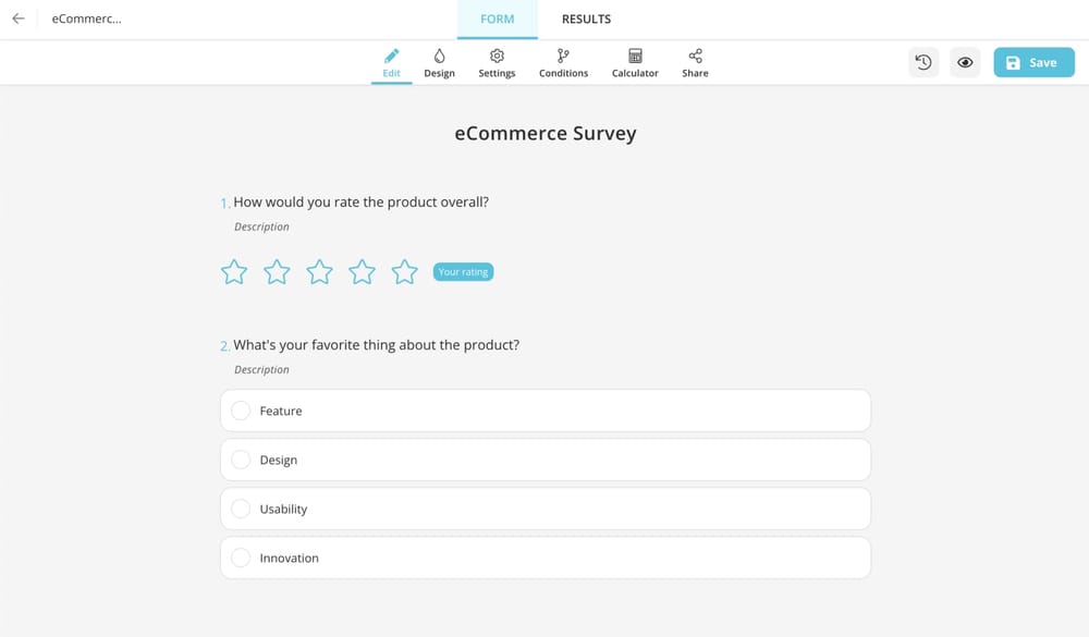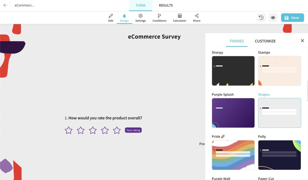 To create e commerce survey, all you have to do is follow these 5 easy steps. Select a ready-made template, edit your form fields, customize your form design, adjust your general form settings and share your template.