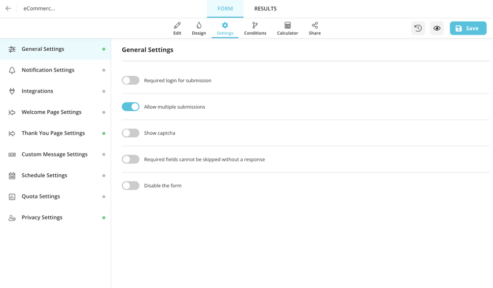 You can use forms.app to create and customize your eCommerce survey for free. forms.app offers countless ready-made templates free to use with its useful features. You can customize your form fields, design them, and embed them into your website easily. You can also add a welcome page and thank you page, and if you don't want more than one submission, you can also enable CAPTCHA and disable or enable multiple submissions.