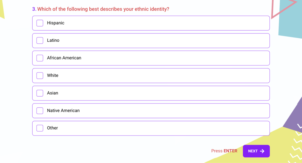 3 - Allow responders to choose a different choice from the ones listed: Ethnicity may not always align with the options provided: It's important to recognize that not all ethnicities can be captured by a fixed set of options. Consider offering an "other" option and allowing respondents to write in their ethnicity.