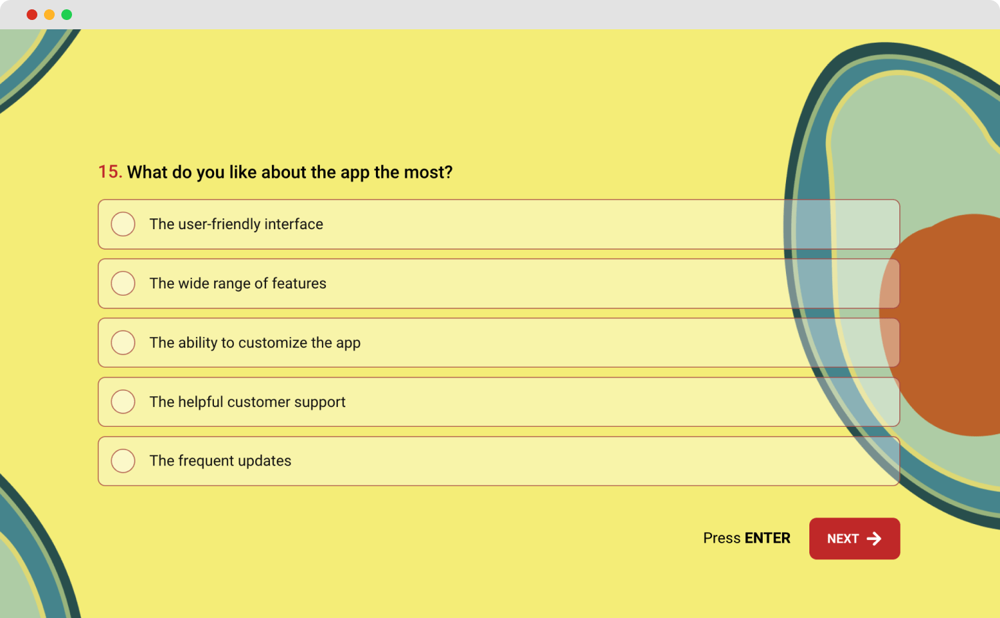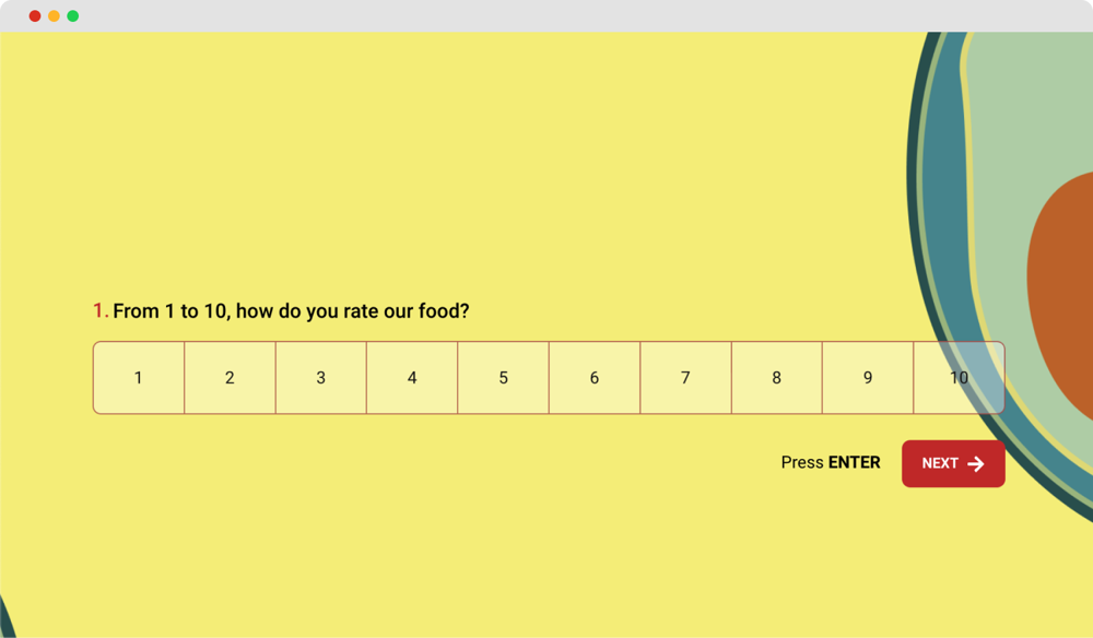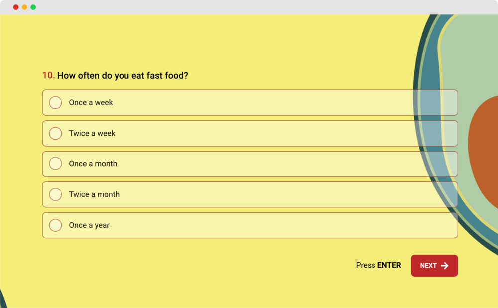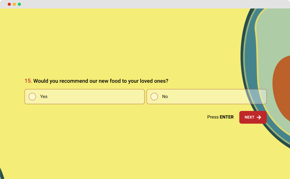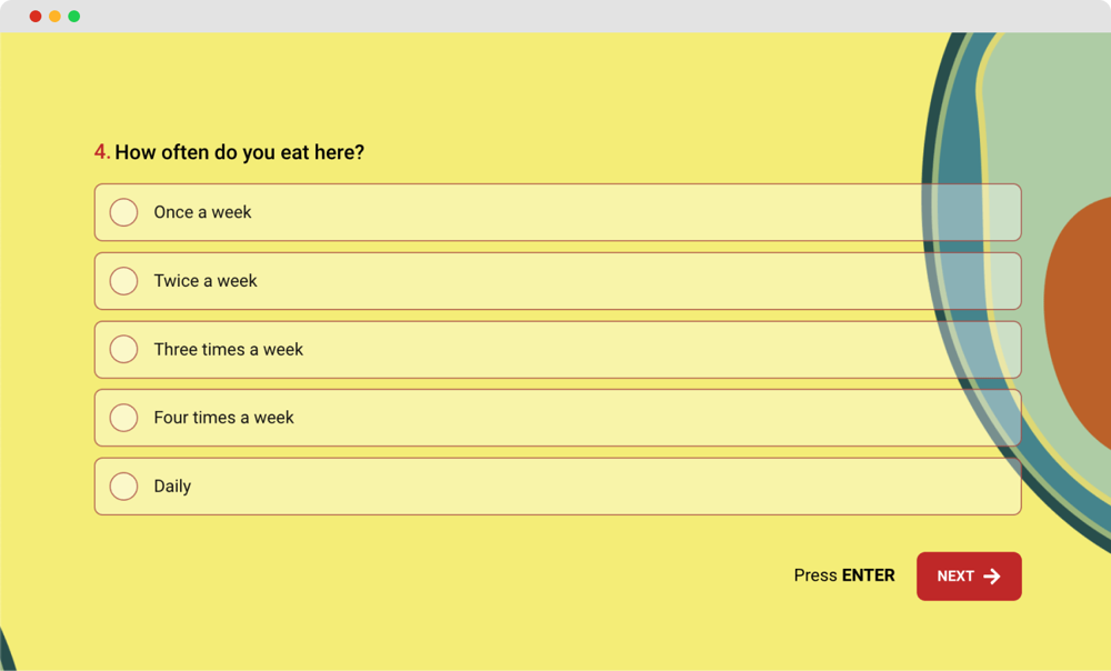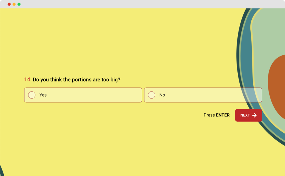 While deciding on the questions, you can choose multiple or open-ended questions based on your needs. You can edit your food survey as you wish. In this part, let your creativity speak for you! You can use the colors of your brands as the background or use your brand’s logo in the survey however you wish.