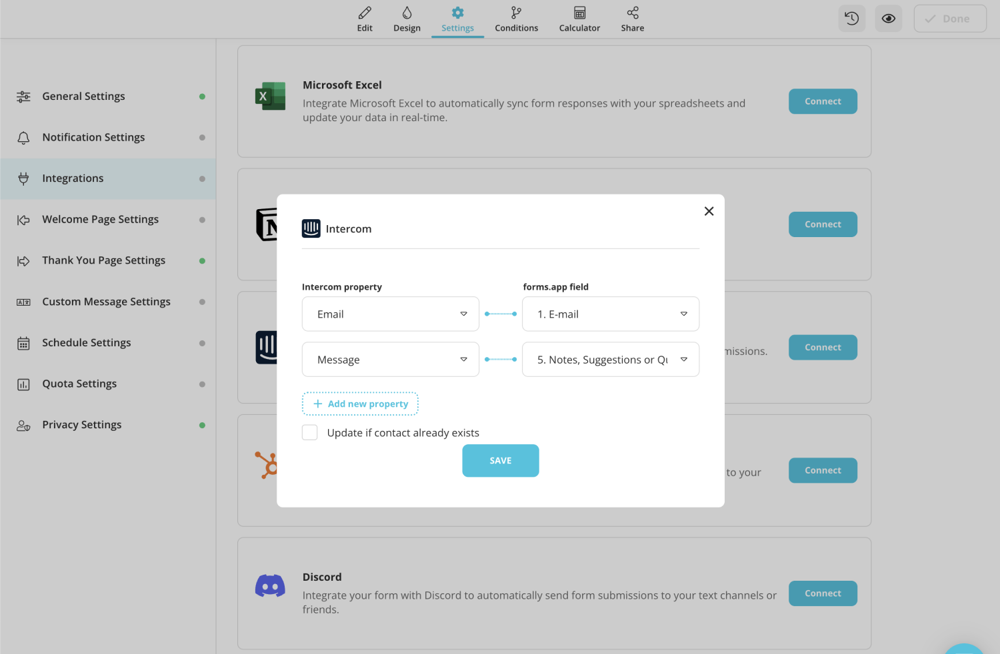If you are an Intercome user, you can now integrate your forms with Intercom and create contacts & conversations automatically from form responses.