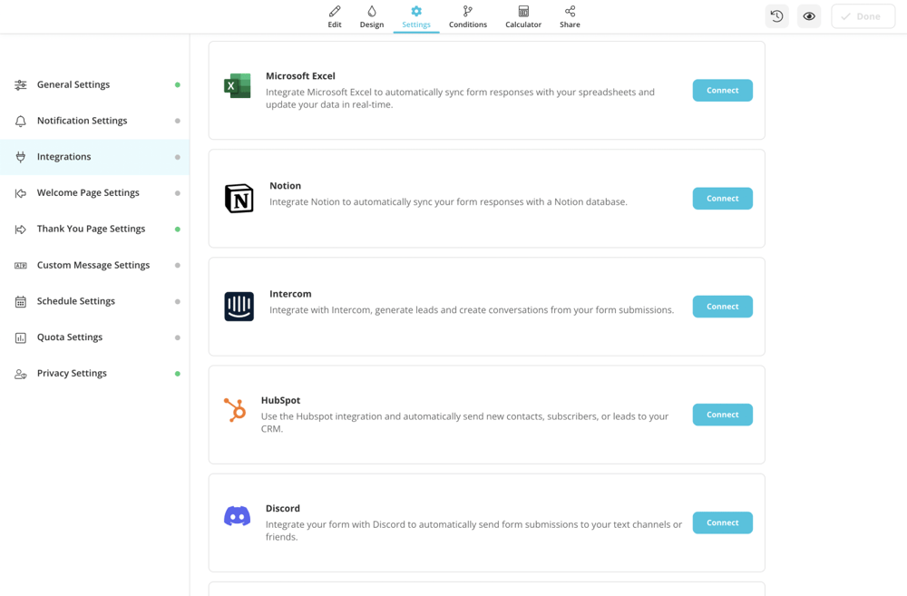 1 - Make sure you are done with the editing of your form and go to “Settings”, then “Integrations”;