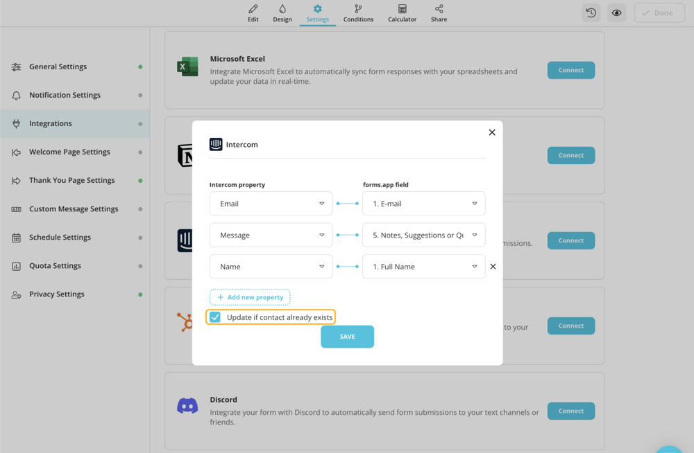 3 - Now it’s time to pair up your form fields with the Intercom properties;