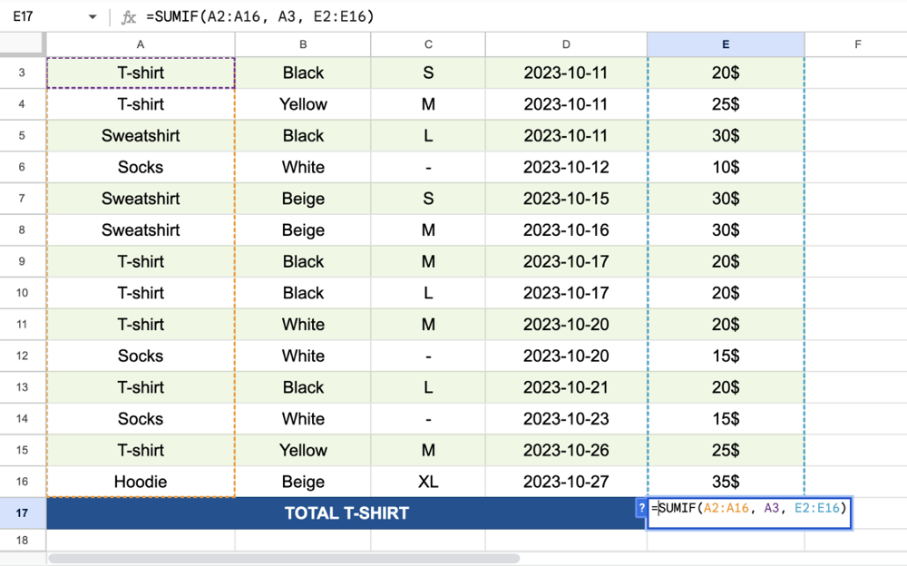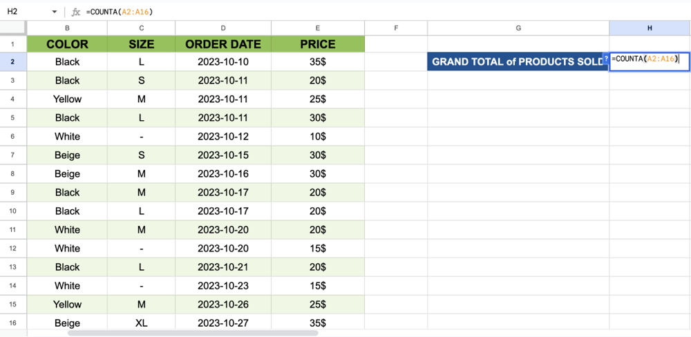 3. For instance, let’s assume you want to check how many T-shirt orders you have; all you need to do is type =COUNTIF(A2:A16, "T-shirt") and press enter. After that, you will see how many “T-shirts” they ordered.