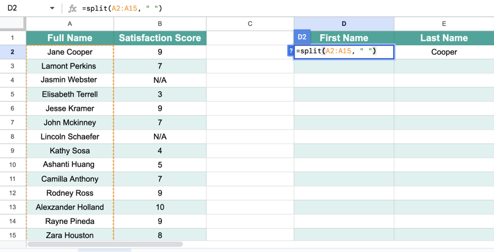 2. For example, you want William and Swift in separate cells instead of a single cell. You need to type =SPLIT (A2:A15, " ")