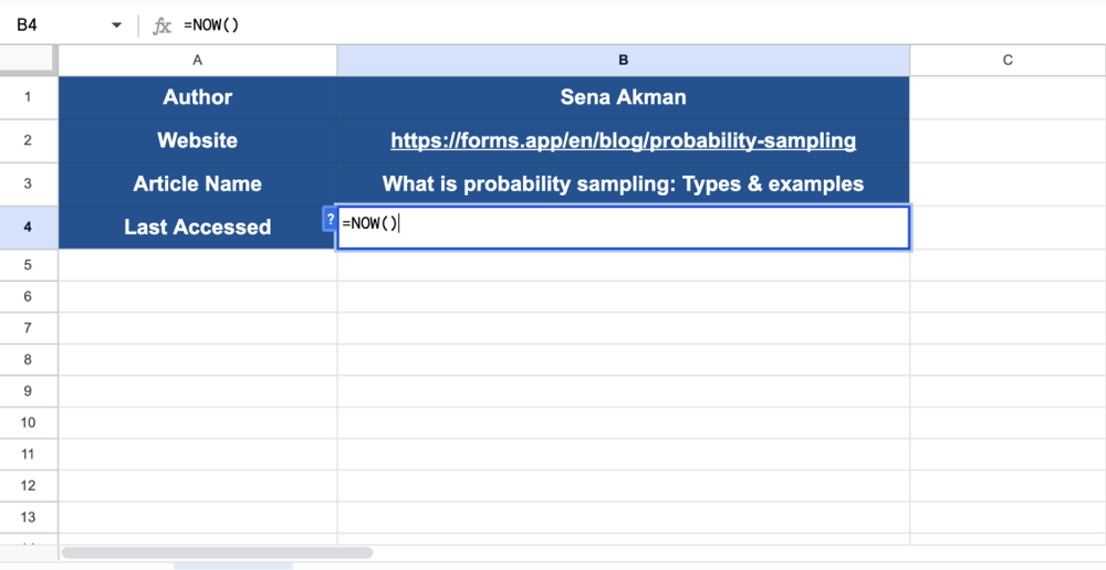 💡 If you need to take note of the time each time you enter data in Google Sheets, the NOW function will help you a lot.
