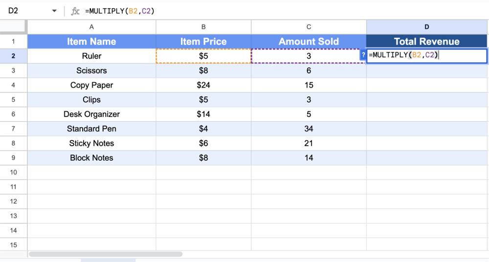 3. =MULTIPLY(B2,C2) would be an example of this formula.