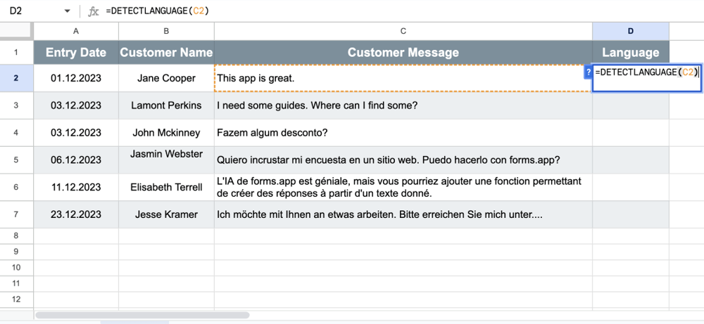 3. For example, if there is an unknown alphabet and you need to learn the language, you can type =DETECTLANGUAGE(C2) and press enter.