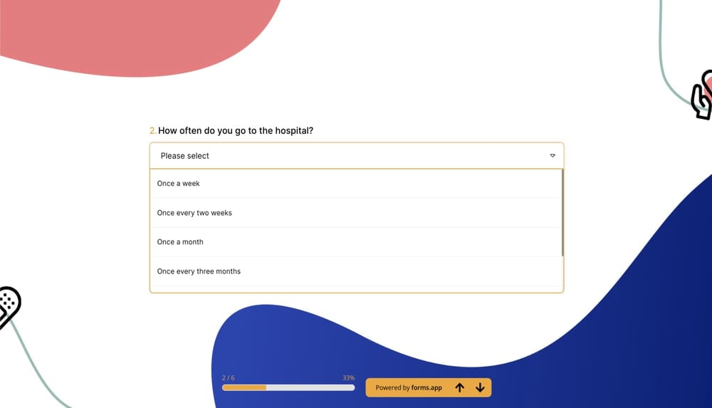 A hospital or health center can find patients' feedback on their care and services by conducting a health survey. You can quickly and efficiently get the answers from the patients using the forms.app questionnaire you created. This survey tool enables medical professionals to pinpoint risk factors in the neighborhood surrounding hospitals or healthcare facilities, including prevalent health practices like drug usage, smoking, poor dietary choices, and inactivity.