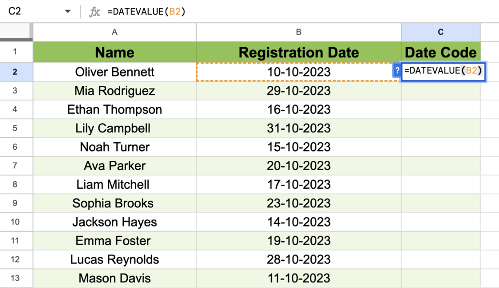 3. For example, if you type =DATEVALUE(B2), which consists of “10-10-2023”, you will get 45209, which represents the serial number of the cell B2.