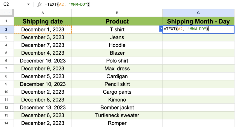 2. =TEXT(A2, "MMM-DD") for a cell that contains “December 1, 2023”; it will give you only the day, which is Dec-01.