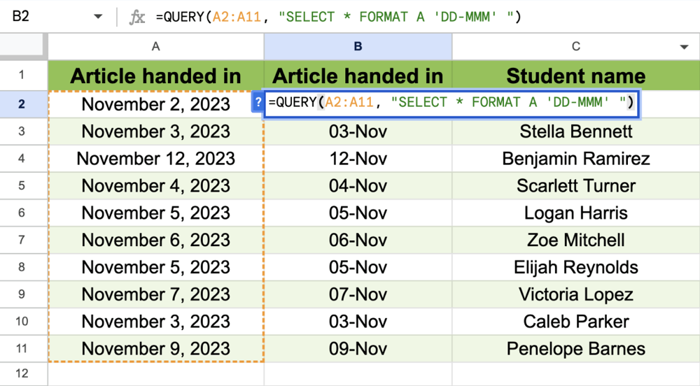 4. For example, if you type =QUERY(A2:A11, "SELECT * FORMAT A 'DD-MMM' "), you will see that the format will change from “November 2, 2023” to “02-Nov”.