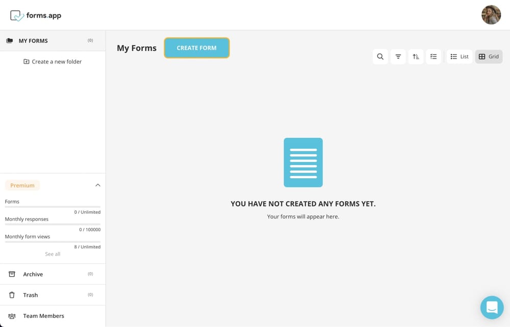 - Go to the “Forms” menu and click “Create Form” to create your form or start from scratch or simply Choose a template