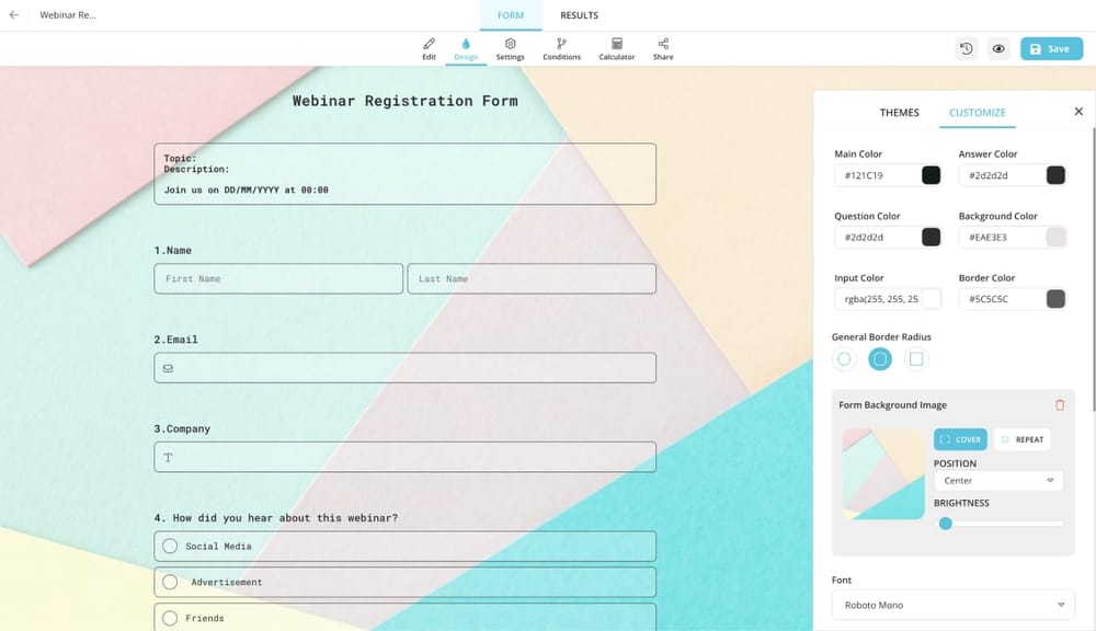 - Free templates - Our form builder makes it easy to create a professional-looking webinar registration form. With the best webinar signup software, You can customize the colors, fonts, and look and feel of your webinar signup form to match your brand's aesthetic.