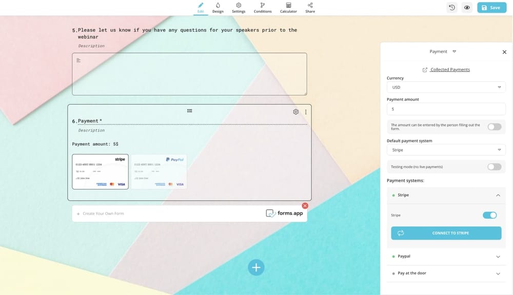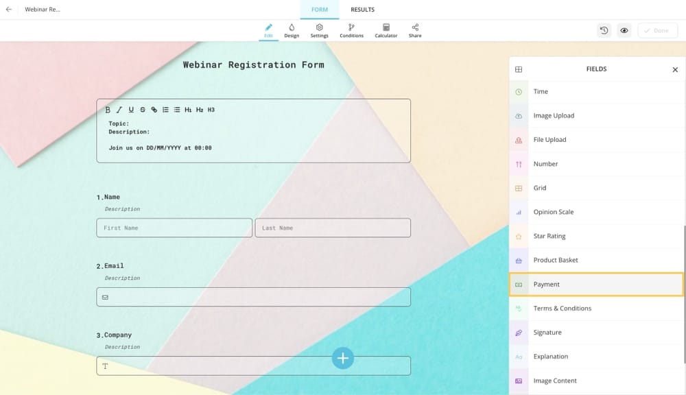 You can collect payment for your webinars using forms.app’s built-in payment section. When you create a form, you'll be prompted to add the payment section. If you're not sure how to add a payment section, follow these steps: