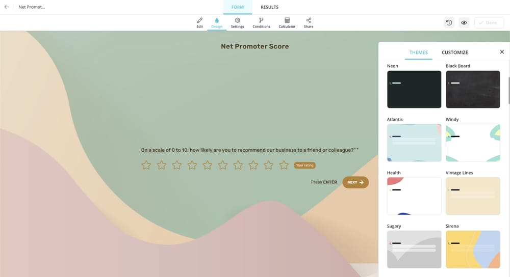 You can customize the NPS survey you created according to you. Theme selection can increase participation in your NPS survey. You can choose from many different themes and customize the theme according to you.