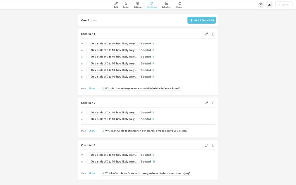 Every business owner aim to develop and improve their brand. A high score on NPS survey questions indicates that your brand is in good standing. Some improvements can be made so that answers to NPS questions are highly scored. By using the conditional logic feature that forms.app offers to its users; you can add or remove questions based on the answers given by the users.