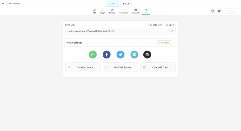 The Net Promoter Score survey template is popular because of its simplicity of implementation and data validity. A short survey always has a high response rate. Despite some surveys where the customer is faced with a long list of questions, This survey helps to quickly assess customer loyalty by asking one or two questions. You can embed the NPS survey you prepared on forms.app on your website.