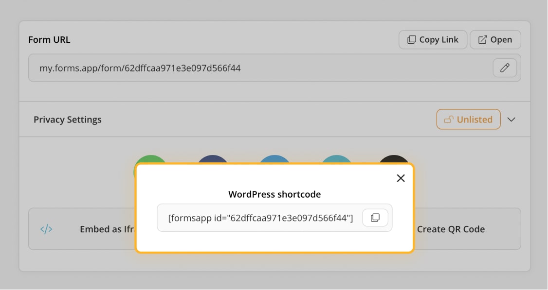 After you have finished creating your form, various ways to share your form will appear on the share page. But since our topic is just WordPress online forms, we will show you how to easily share your form on your WordPress website. It should also be noted that you can do this with the form builder WordPress plugin of forms.app. If you are constantly using forms in your WordPress site, downloading this plugin will speed up your work.