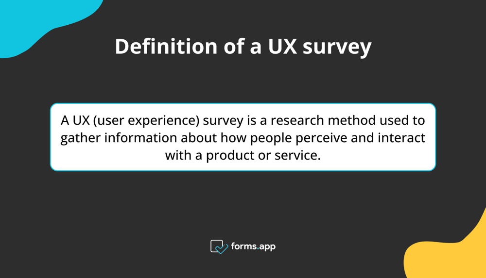 A UX (user experience) survey is a research method used to gather information about how people perceive and interact with a product or service. UX surveys are often conducted through online questionnaires or website feedback surveys, and they are designed to gather feedback on the usability, effectiveness, and enjoyment of a product or service. The goal of a UX survey is to identify areas where the product or service can be improved, as well as to understand what users like and dislike about it.