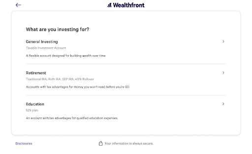 Wealthfront’s form is a multi-page form, so users move to the next page depending on the option they picked on the first page. Those who want to earn interest on their savings will specify who owns the account. And those who want automated investing will choose whether they want a general investment account, a retirement account, or an education account.